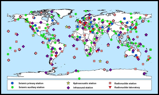 The figure shows location of stations installed under the International Monitoring System of the CTBTO around the world.